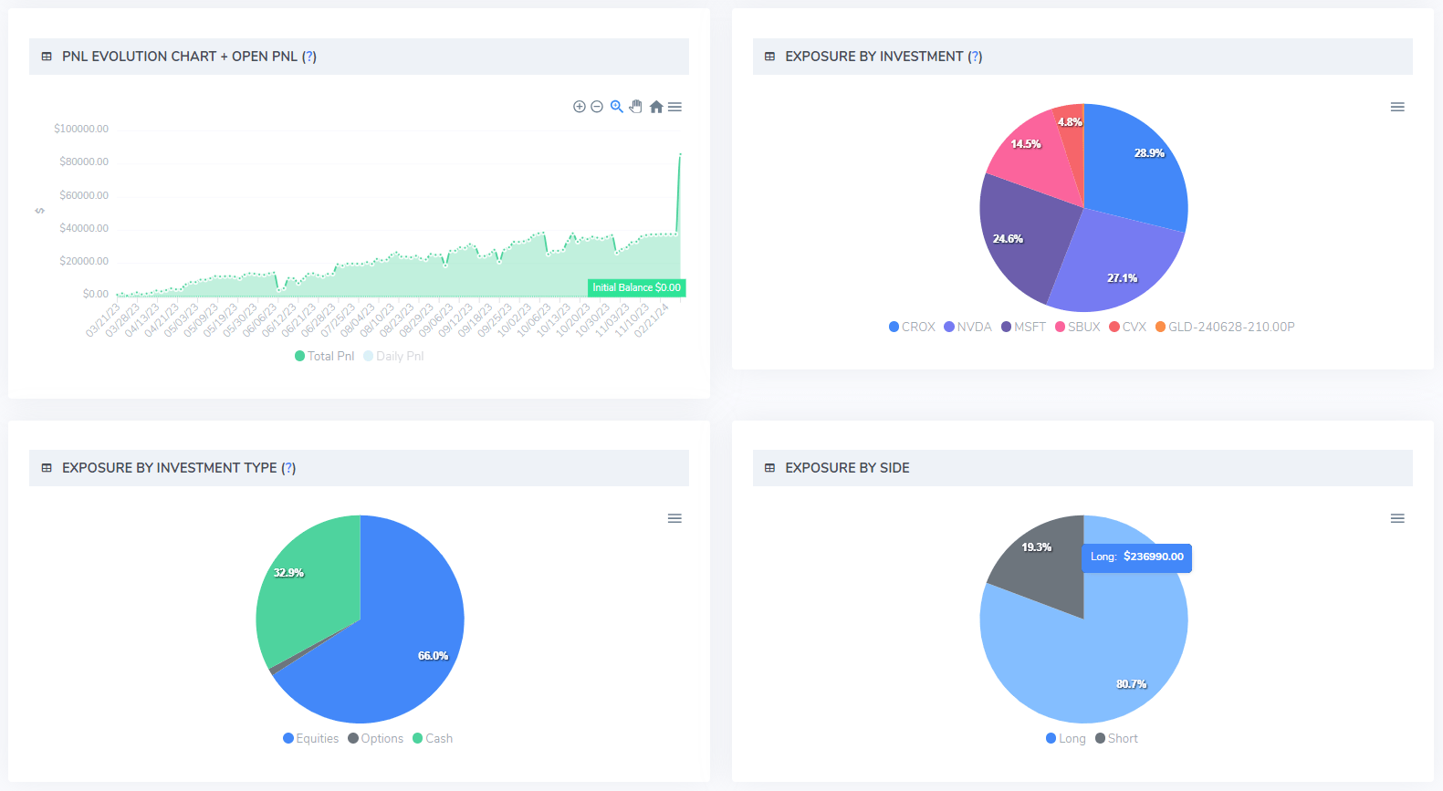 Track open r-multiples, stops, targets, partially closed pnl, cost, % returns, avg price, open risk and much more.